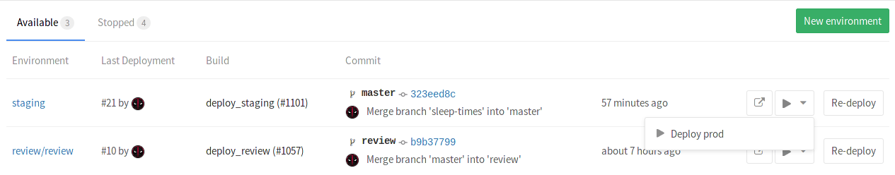 .gitlab-ci.ymlfirst. They will be automatically created for you after the first deploy.- The environments page can only be viewed by Reporters and above. For more information on the permissions, see the permissions documentation.