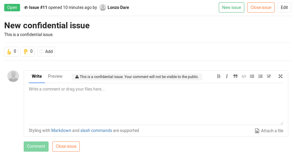 Likewise, while inside the issue, you can see the eye-slash icon right next to the issue number, but there is also an indicator in the comment area that the issue you are commenting on is confidential.